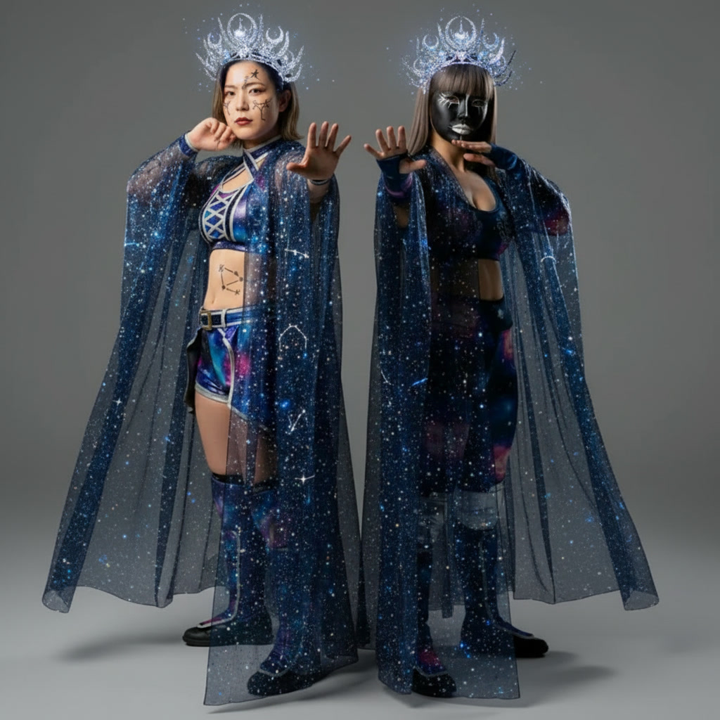 Die ersten tiefen Synthesizer Klänger von “Children of the Stars” erfüllen die Halle, während das matte Rauschen einer Galaxie auf der K-Vision erscheint und rundherum per Licht weitere kleine und große Sterne projiziert werden. Als die ersten Gitarrennoten ertönen, quillt ein Nebel aus Trockeneis vom Boden herauf. Als der Bass einsetzt, flammen gefühlt hunderte winzige, kaltweiße LED Lichter am Entrance auf und fangen die Körper von Nytoa und Cassiopeia von den Cosmic Rockers ein. Der Nebel hüllt sich um ihre Körper, arbeitet sich langsam nach oben, wo er durch ihre transparenten Sternenroben steigt. Er ist so kalt, dass der Atem, den die beiden von sich abgeben, ebenfalls sichtbar wird. Ihre kosmischen Kronen, die sie auf den Köpfen tragen, leuchten wie ein eigenes Sternenuniversum. Als das Schlagzeug den ersten Beat vorgibt, setzen die beiden nacheinander synchron den ersten Schritt. Nancy Kimura: “Und als nächstes, sie vertreten dieses Jahr Supreme Japan Pro Wrestling, hier sind Nyota und Cassiopeia, die COOOSMIC ROOOOCKEEEEERS!” Langsamen Schrittes nähern sie sich den Ring, als hätten sie hier alle Zeit der Welt. Nyota streckt einen Arm unter ihrer Robe hervor und die aufgemalten Sternenbilder leuchten im Neonlicht, welches auf sie gerichtet wird. Cassiopeia hat zwar keine Sternenbilder auf ihrem Körper gemalt, dafür trägt sie aber schwarzes Facepaint mit silbernen Elementen, welche ebenfalls im Neonlicht hell aufleuchten. Die Fans in den ersten Reihen legen ihre Hände um ihre Arme und reiben sie sich warm. Bei dem Entrance wird selbst ihnen irgendwie kalt. Die beiden erreichen dann den Ring und umkreisen ihn in entgegengesetzte Richtungen, als wären sie zwei Planeten in ihrer eigenen Umlaufbahn. Sie steigen dann am Apron hoch, alles synchron, genau wie sie zur gleichen Zeit in voller Montur durch die Seile steigen und gemeinsam zur RIngmitte laufen. Samba & Spice und Dragonfire sind auf Sicherheitsabstand gegangen, was den Cosmic Rockers die Chance gibt, sich den Lobotomy Blues Memorial Cup einmal von Nahem zu betrachten. Cassiopeia berührt mit ihrem Zeigefinger das goldene Metall, während im Hintergrund sich Samba und Spice die Oberarme reiben. Schließlich geht das Licht wieder an und die Musik verstummt. Kreston Breckel: “HATSCHI! Godverdomme, ist mir kalt.” Kathy Strong: “Ja, da lief mir auch ein kalter Schauer über den Rücken.” Langsam nähert sich Stellina Davidovich den Cosmic Rockern. Stellina Davidovich: “Hi, willkommen in der IPW, Nyota und Cassiopeia. Möchtet ihr etwas zu euren Gegnern oder dem Turnier sagen?” Nyota nimmt Stellina das Mikro widerstandslos aus der Hand und führt es dann zu ihren Lippen. Sie legt den Kopf schief und mit einer fast schon kindlichen Stimme, die nicht zu ihrem Äußeren passt, spricht sie ins Mikrofon. Nyota: “Die Sterne haben geantwortet … Dragonfire … Samba & Spice … die Sterne in euch leuchten nicht stark genug … es herrscht Dunkelheit um euch herum …. eure Sterne sind verglüht … sie sterben … es ist völlig ausgeschlossen … dass ihr den Lobotomy Blues Memorial Cup gewinnt …” Nyota reicht das Mikrofon an Cassiopeia weiter. Die Wrestlerin mit dem schwarzen Facepaint blickt in die Augen ihrer Gegner, die jeweils als Team zusammen in einer der Ringecken stehen. Als Cassiopeia spricht, klingt ihre Stimme verzerrt, wie mit einem Echo unterlegt. Cassiopeia: “Die Sterne haben gesprochen … sie haben uns hierhin geleitet … in die IPW … für diesen Pokal … sieben andere Teams …. wollen ihn auch … werden aber scheitern … In den Sternen steht es geschrieben … dass die Cosmic Rockers … so erfolgreich werden wie der Lobotomy Blues …. ihr Sternenbild leuchtet noch im Universum … wir haben es entdeckt … wir sehen mehr als ihr … macht euch bereit!” Cassiopeia reicht das Mikrofon an Stellina herüber, die es nach etwas Zögern dann vorsichtig wieder an sich nimmt. Stellina Davidovich: “Ein Applaus für die Cosmic Rockers, die in ihrer recht jungen Karriere bereits am Lobotomy Blues Memorial Cup teilnehmen und damit …” Wieder kann sie nicht zuende sprechen, denn das nächste Theme ertönt.