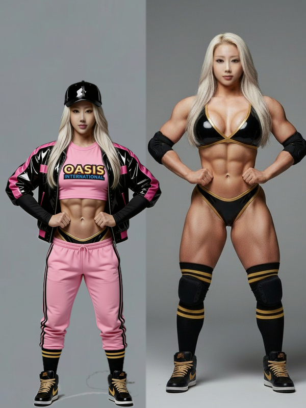 SO-SO-SO-YUN-LEE Tariq Al-Rasheed erscheint jetzt auch im Spotlight, als er von der Seite hineinläuft und für seinen Schützling applaudiert. Die Südkoreanerin trägt eine pinke Jogginghose mit seitlichen schwarzen Streifen zu einem bauchfreien pinken Top mit Oasis International Aufdruck. Dazu trägt sie schwarze Kniestrümpfe und goldene Turnschuhe, eine schwarz-pinke Jacke und eine schwarze Cap. Die GWS Heavy Metal Weight Championship, die sie zufällig bei der Award Show gewann, prangt wie ein Schatz um ihre Hüften. So-Yun Lee löst den Titelgürtel von den Hüften, hebt diesen nach oben und reicht ihn dann Tariq Al-Rasheed, welcher die Championship entgegen nimmt. Vielleicht kommt ja gleich eine zweite Championship hinzu? Dann schlüpft sie aus ihrer Jacke heraus, wirft diese zur rechten Seite, wirft die Cap wie eine Frisbee zur linken, zerreißt dann das Top vorne, lässt es nach hinten zu Boden fallen und mit einem Ruck (und dank Druckknöpfen an der Seite. Kinder der End 90er werden sich erinnern) ist auch die Jogginghose vom Körper gerissen. Nur noch in schwarz-goldenen Kniestrümpfen, ebenso farbigen Turnschuhen und ein knappes Höschen mit passenden BH in der gleichen Farbkombination, spannt So-Yun Lee die Muskeln an Armen und Beinen an und gibt ein tolles Bild im Laserlicht ab. Nancy Kimura. “Als erstes auf dem Weg zum Ring, begleitet von Tariq Al-Rasheed, sie repräsentiert Oasis International und ist die amtierende GWS Heavymetalweight Championesse! Aus Busan, Südkorea, hier ist „THE HAEUNDAE HELLION“ SO-YUN LEEEEEEE!“ So-Yun Lee bewegt sich nach vorne, läuft über den LED Catlwalk entlang, welcher unter ihr pinke Laserstrahlen projiziert. Tariq Al-Rasheed bewegt sich hinter seinem Schützling her, trägt ihren Titelgürtel voller Stolz und hat dabei auch einen guten Blick auf sie. Kreston Breckel: “Schau dir diese Muckis an. Ich kann Tariq Al-Rasheed nur zu gut verstehen. Wenn ich mal ein Wrestling Stable habe, dann möchte ich auch solch eine Athletin wie So-Yun Lee in meinen Reihen haben.” Kathy Strong: “Du willst doch nur spannern, gib’s zu. Von hartem Training hast du doch keine Ahnung.” Kreston Breckel: “Aber ich kann eine Ästhetik bewerten.”